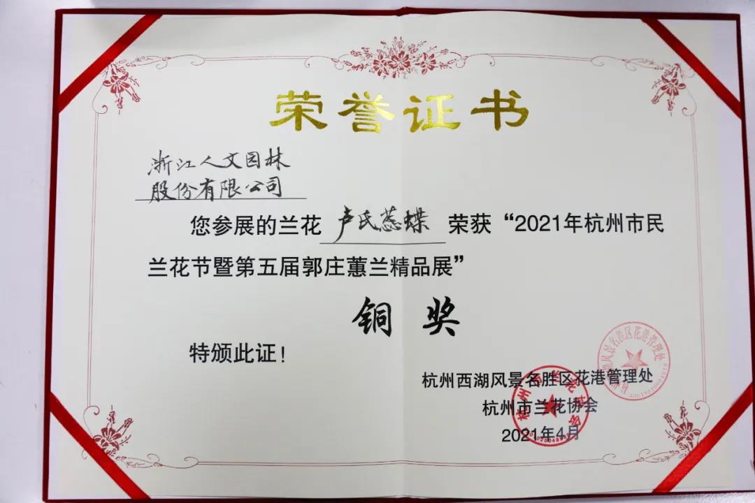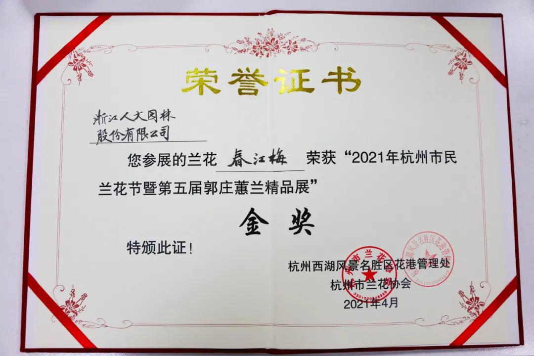 春至花開,時值賞花好時節。優雅的春蘭姑娘們剛剛謝幕,這不,蕙蘭仙子又將登場。4月1日, “一展芳華?蘭韻杭城”——2021年杭州市民蘭花節暨第五屆郭莊蕙蘭精品展在郭莊開幕,現場共展出精品蕙蘭100余個品種,300多盆。開幕式上揭曉了本次蕙蘭展的獲獎名單,浙江人文園林股份有限公司的展品“春江梅”再次奪得金獎,展品“盧氏蕊蝶”榮獲銅獎,副總裁錢茜萍出席開幕式并代表公司領獎。