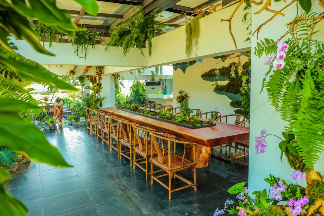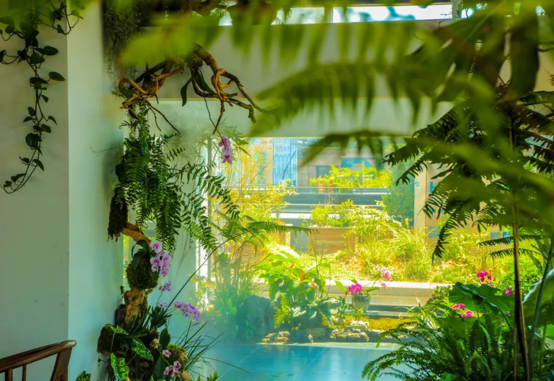 參會的專家顧問及副主任委員們還參觀了人文園林位于屋頂的花園。雖然杭州進入了炎熱的夏季,但花園內依然綠意盎然,行走在其間仿佛置身于雨林中。這里同時作為植物品種收集種植觀測區,現已種植植物品種約400多種,其中包括睡蓮、鳶尾、蘭花、杜鵑、紫藤等人文園林特色植物。