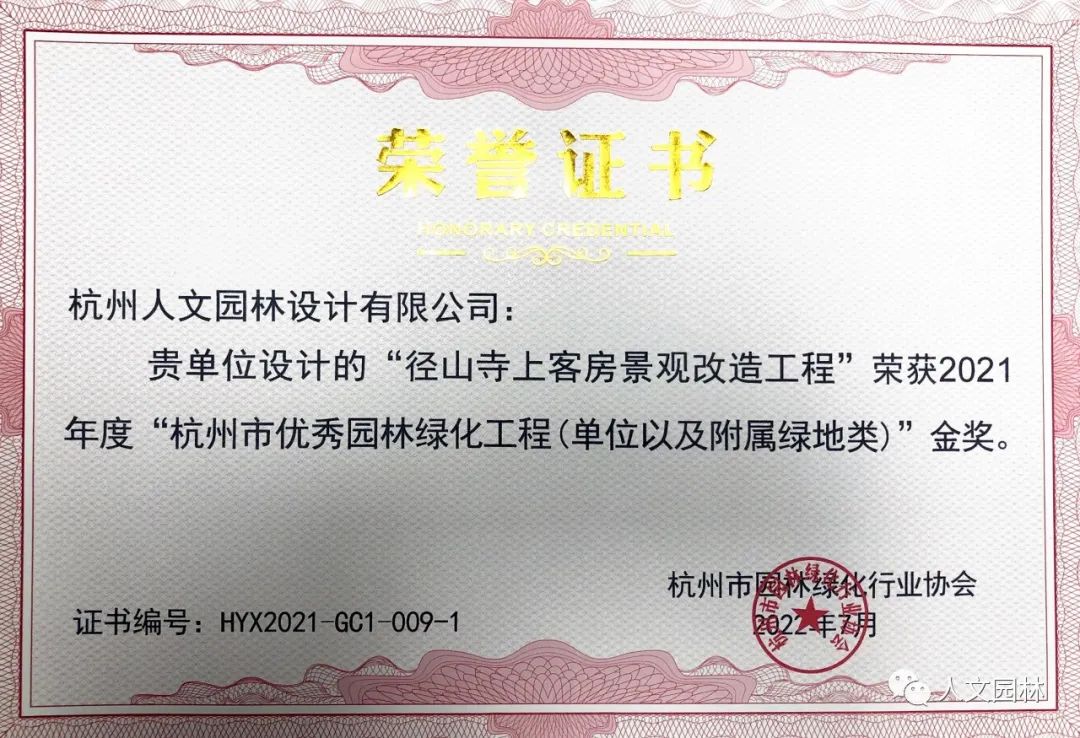 10月13日,杭州市綠化行業(yè)協(xié)會第三屆七次會員大會暨“2021杭州市優(yōu)秀園林綠化工程獎”頒獎大會圓滿舉辦。人文園林總獲得3金2銀1銅佳績,其中徑山寺上客房景觀改造項目、杭州亞運村技術(shù)官員村二期公寓景觀項目等榮獲金獎。人文園林將珍惜榮譽、再接再厲,進一步提升提高專業(yè)技術(shù)、建設(shè)品質(zhì)、管理水平,永葆初心,以匠心鑄匠魂,打造更多更優(yōu)的作品。