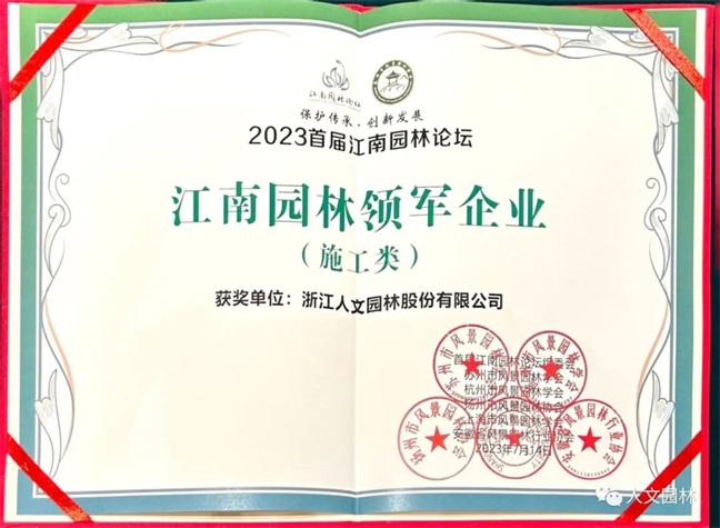 首屆“江南園林論壇”對(duì)“江浙滬皖”地區(qū)的34家優(yōu)秀園林企業(yè)進(jìn)行了表彰,授予“2023首屆江南園林論壇江南園林領(lǐng)軍企業(yè)(施工類)”的榮譽(yù)稱號(hào),人文園林獲得了這一殊榮。